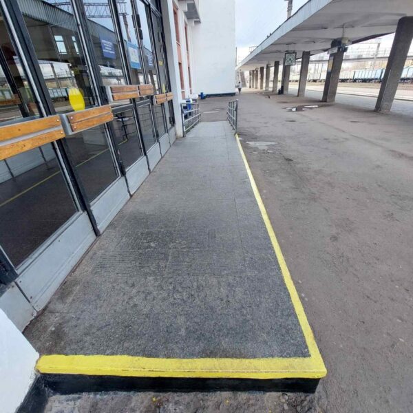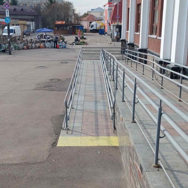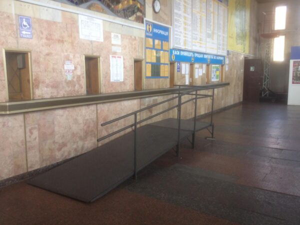 Забезпечено безпроблемне пересування по територіях залізничних вокзалів осіб з інвалідністю, які користуються кріслом – коляскою. Для безперешкодного проходу для людей з вадами зору на пішохідному шляху відсутні кущі зелених насаджень та гілки дерев, вивіски та інші предмети нижче 2,10 м. Також на вокзалах Житомир та Коростень встановлені на сходах розділові поручні у двох рівнях (дорослі – 0,7 та 0,9 м і дитячі -0,5 м). На залізничних вокзалах в наявності пандуси, що забезпечують підйом осіб з інвалідністю на рівень входу в приміщення.
